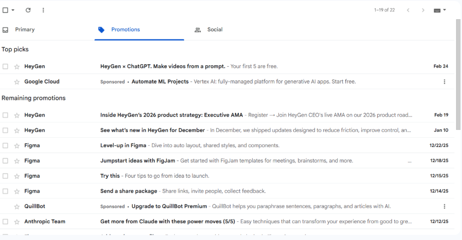 Newsletters and promotional emails are some of the leading contributors that inflate your inbox. A lot of users get dozens of files each week, and they live quietly in the background. The tabbed inbox of Gmail makes it quite simple to flag them in bulk.