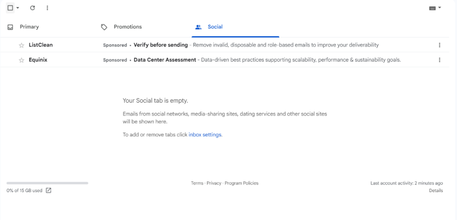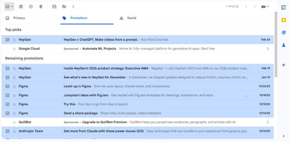 - You can perform a similar action in the “Social” tab, which generally contains notification emails accumulated over the years from platforms that you do not actively use.