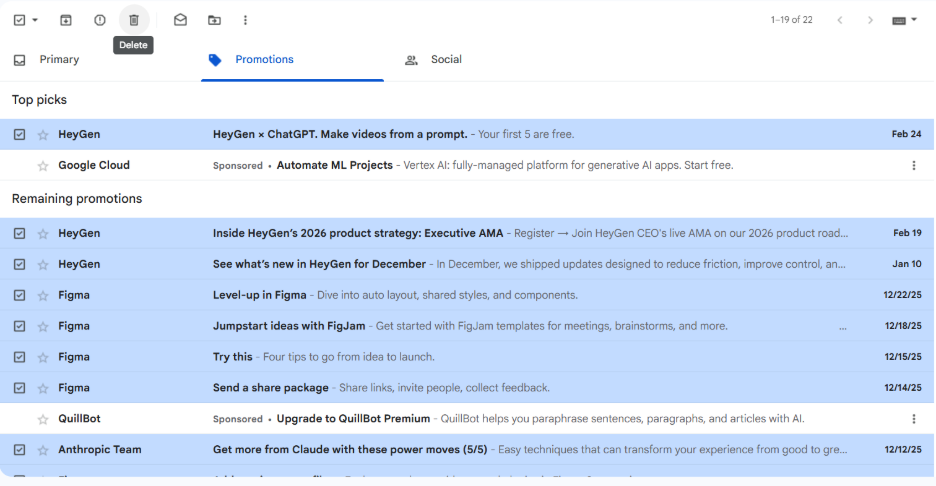 Employing a more fine-tuned approach, utilize the search query category:promotions older_than:6m to find emails that are now older than 6 months. This will make sure that your recent receipts or deals that you might still require do not get accidentally deleted. If you want to go one step further, you can consider utilizing methods to Mass Delete Emails on Gmail to remove complete categories in bulk in a single action.