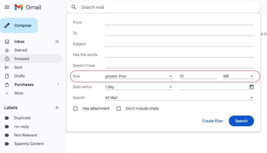 - Open the Gmail and type the search filter in the search bar “has:attachment larger:10MB” to find emails heavier than 10 MB.